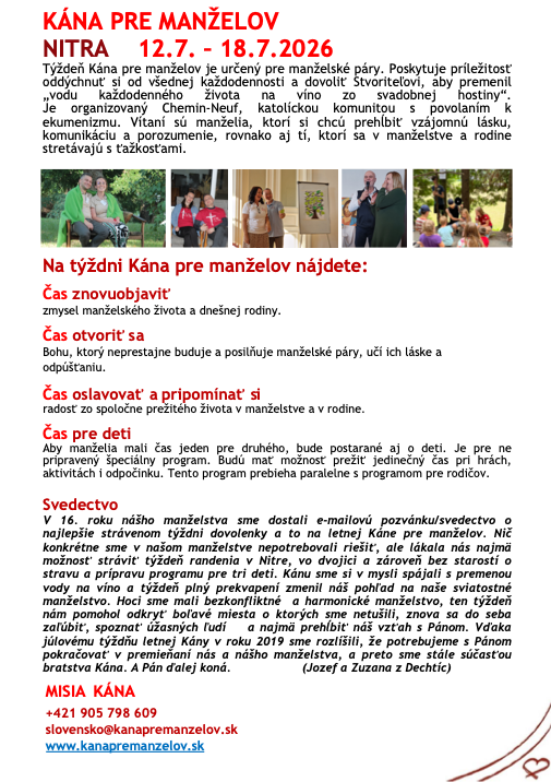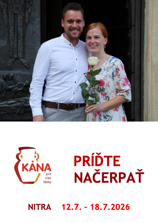 Milí manželia, ak vo vašom srdci žije túžba po hlbšej blízkosti, väčšom porozumení pre vaše manželstvo, prijmite pozvanie na Týždeň Kána v Nitre do kňazského seminára sv. Gorazda v dňoch 12. – 18. júla 2026. Je to jedinečný čas zastaviť sa, pomenovať to, čo je medzi vami krásne, ale aj to, čo potrebuje uzdravenie. Mnohé páry svedčia, že práve tento týždeň zmenil ich pohľad na manžela či manželku a priniesol novú silu milovať. Viac informácií nájdete na www.kanapremanzelov.sk alebo na farskej výveske.