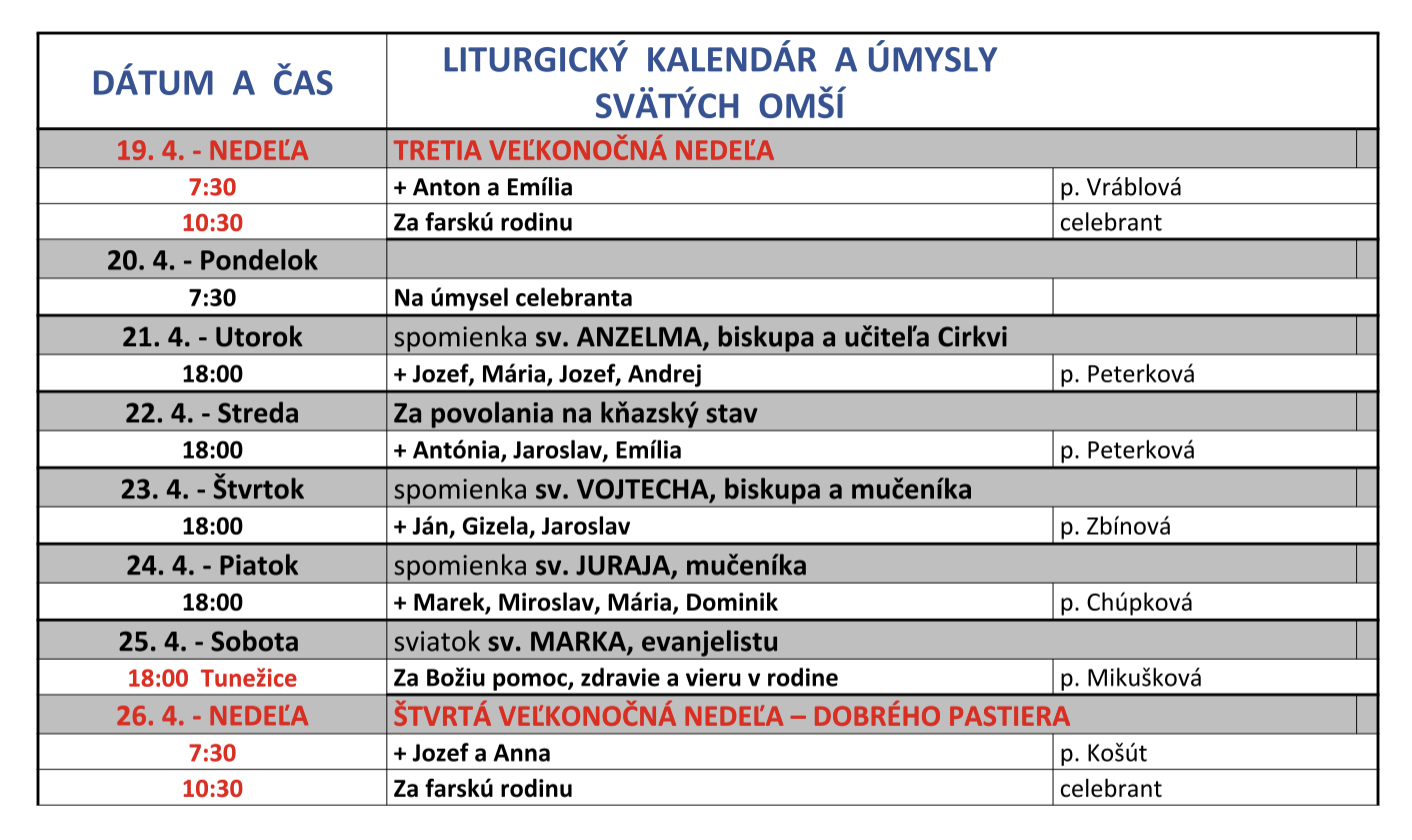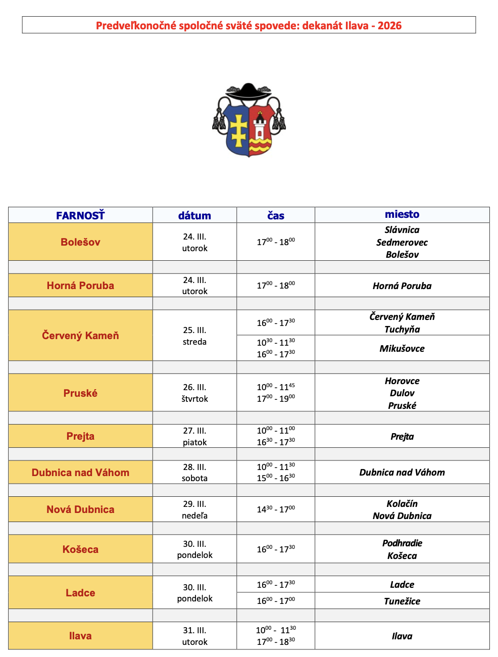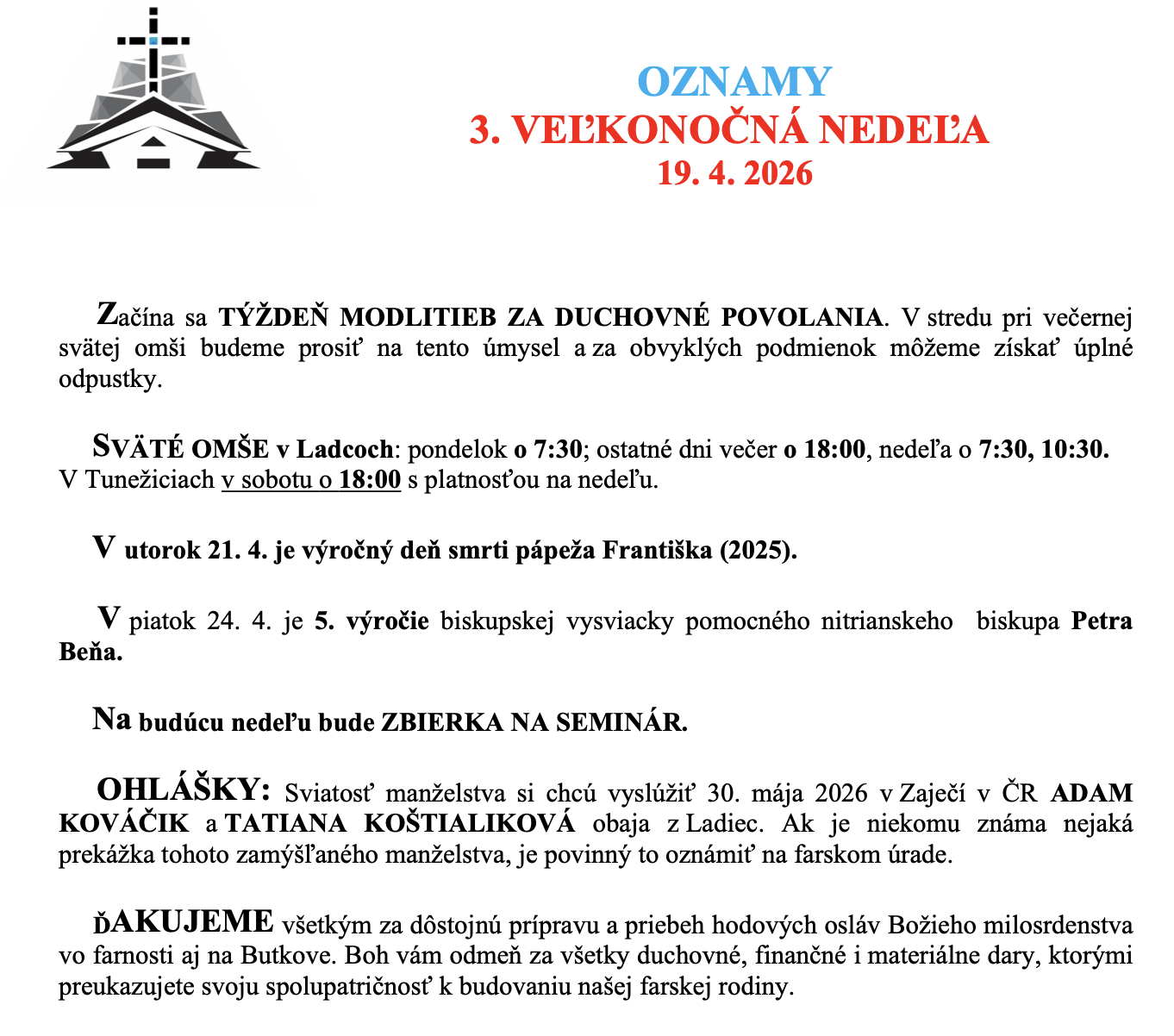 Milí manželia, ak vo vašom srdci žije túžba po hlbšej blízkosti, väčšom porozumení pre vaše manželstvo, prijmite pozvanie na Týždeň Kána v Nitre do kňazského seminára sv. Gorazda v dňoch 12. – 18. júla 2026. Je to jedinečný čas zastaviť sa, pomenovať to, čo je medzi vami krásne, ale aj to, čo potrebuje uzdravenie. Mnohé páry svedčia, že práve tento týždeň zmenil ich pohľad na manžela či manželku a priniesol novú silu milovať. Viac informácií nájdete na www.kanapremanzelov.sk alebo na farskej výveske.